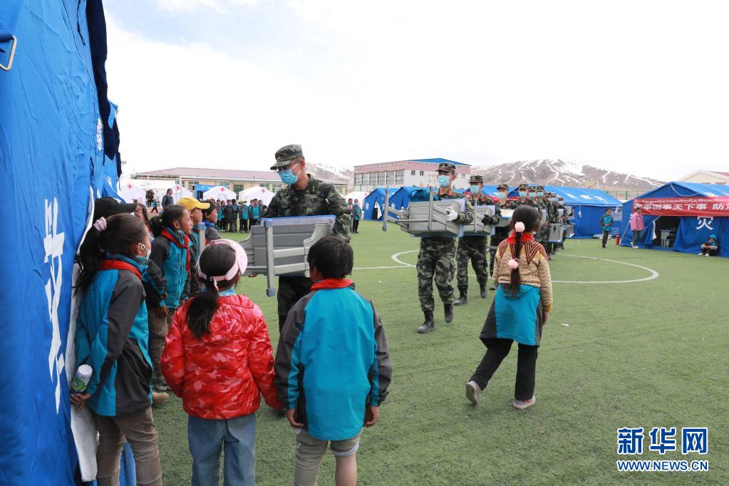 5月24日,武警青海總隊果洛支隊機動大隊排長張國睿(前一)和戰(zhàn)友為花石峽鎮(zhèn)藏文中心寄宿制小學(xué)的帳篷教室搬運課桌。新華社記者 劉芳 攝