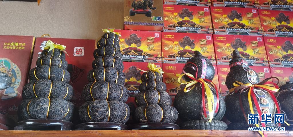 在位于西藏拉薩的一家茶葉公司的門店內(nèi)擺放著造型獨(dú)特的茶葉制品(4月23日攝)。新華社記者 張京品 攝