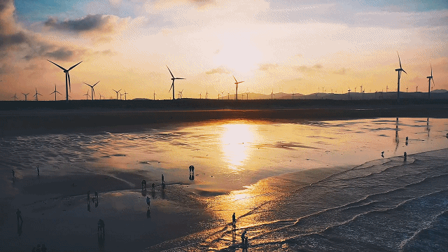 平潭的浪漫从不止于人文,更藏在大自然的鬼斧神工里。长江澳风车田是必去的“爱情打卡地”——数十座白色风车矗立在海边的滩涂上,叶片在风中转动,与远处的蓝色海面、金色沙滩组成一幅油画。