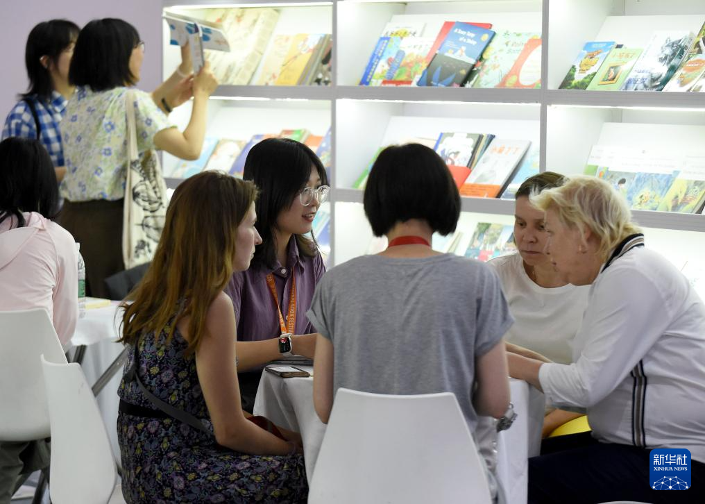 6月19日,在北京展区,海豚出版社的工作人员与来自俄罗斯的客人商洽图书版权。