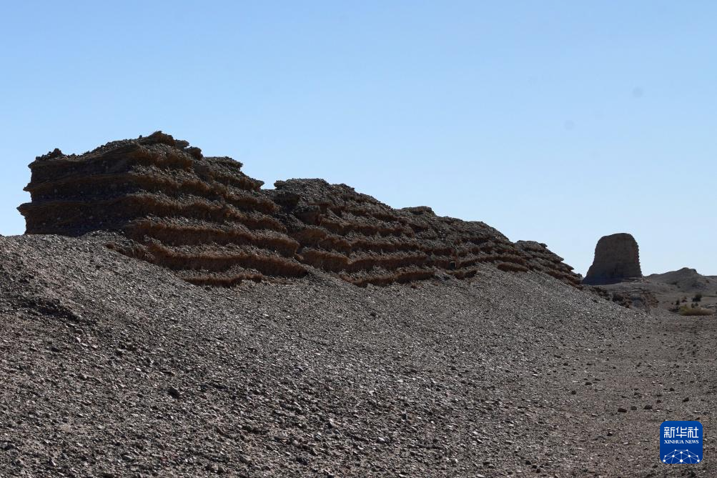 7月17日在甘肃省敦煌市玉门关遗址区拍摄的当谷燧和汉长城(无人机照片)。