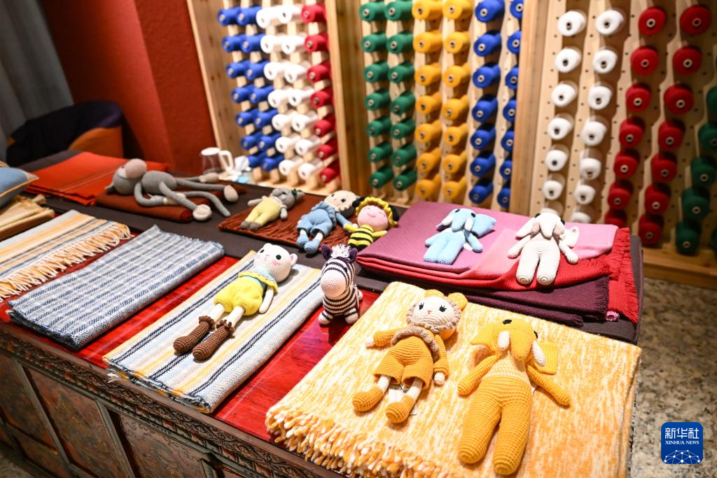 这是在西藏日喀则市一间门店拍摄的玩偶、围巾、披肩等江孜氆氇产品(9月1日摄)。