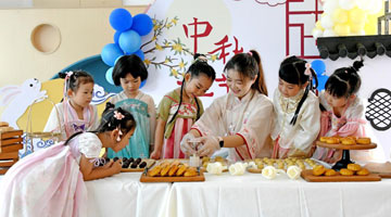 9月12日,河北省邢台市第二幼儿园的小朋友在老师的指导下学习做月饼。