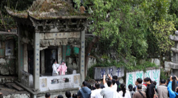 10月26日,饰演陈白露角色的青年演员在天津金街一处建筑阳台表演话剧《日出》片段。