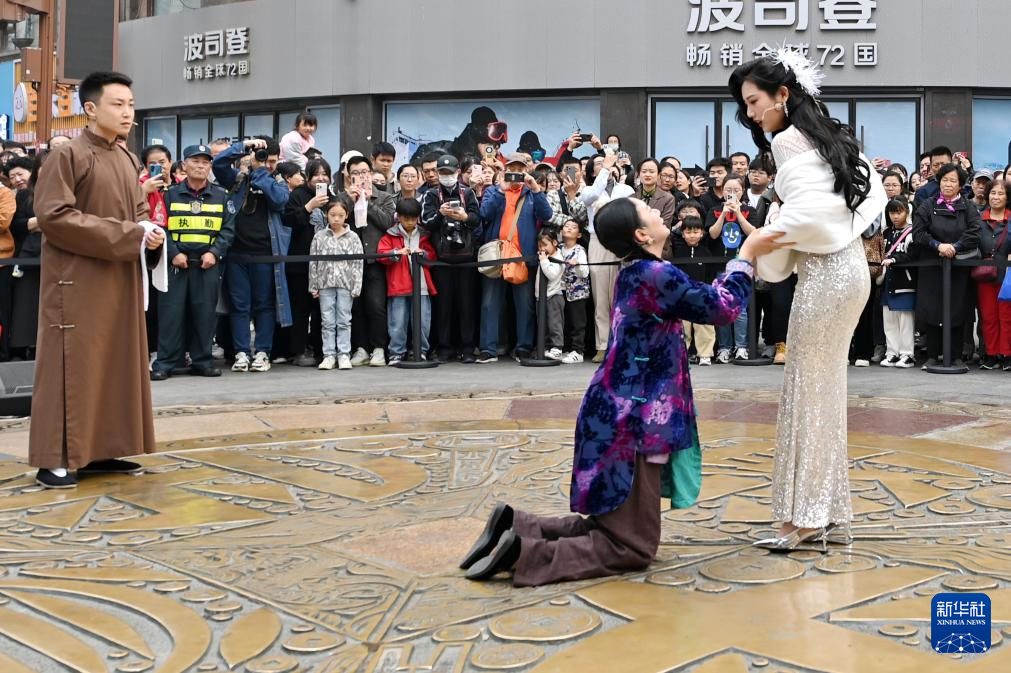 10月26日,演员在天津金街表演话剧《日出》片段。