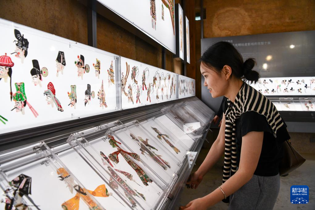 一名游客在长守戏剧谷里参观了解皮影戏(11月9日摄)。