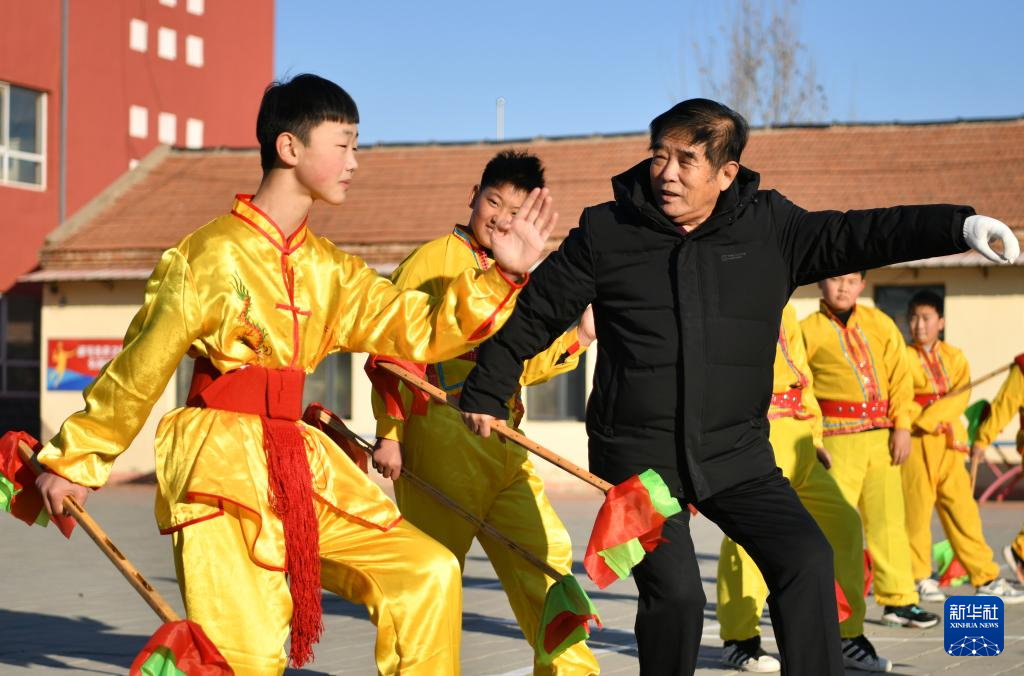 12月22日,在南皮县冯家口镇车官屯小学,沧州落子第六代传承人张洪通(前右)在指导学生练习沧州落子。