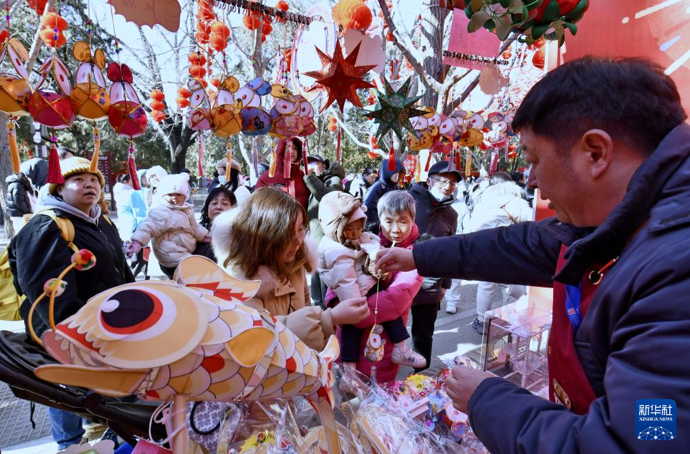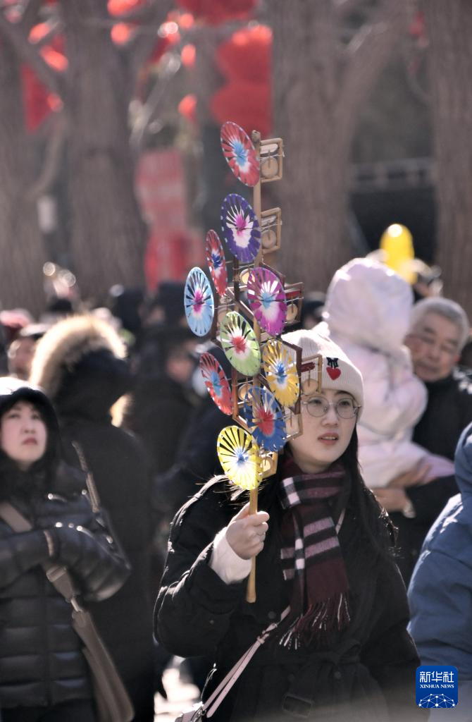 2月3日,市民在地坛春节文化庙会上购买风车。