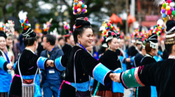3月16日,在新西兰奥克兰举行的新西兰中国儿童文化日活动上,一名游客与身穿中国少数民族传统服饰的工作人员合影。