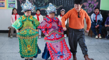 在乌鲁木齐市水磨沟区苇湖梁片区立井南社区,小朋友在公益书法课上跟随老师体验写书法(3月22日摄)。