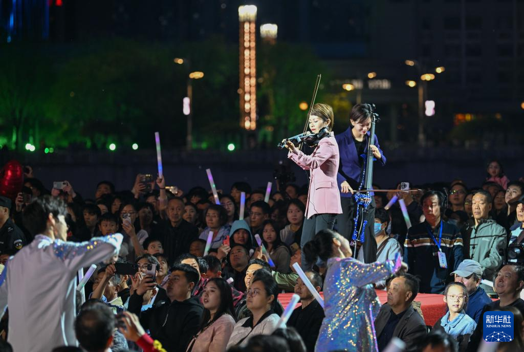 4月19日晚,演员在天津津湾广场亲水平台为市民游客演出。