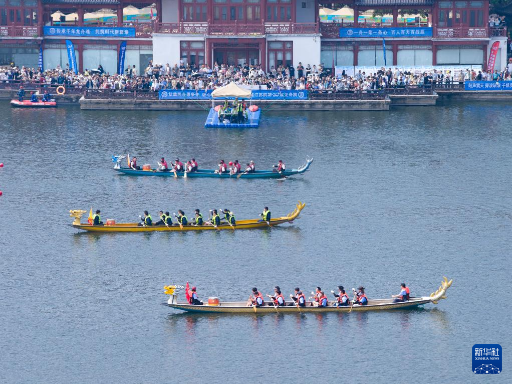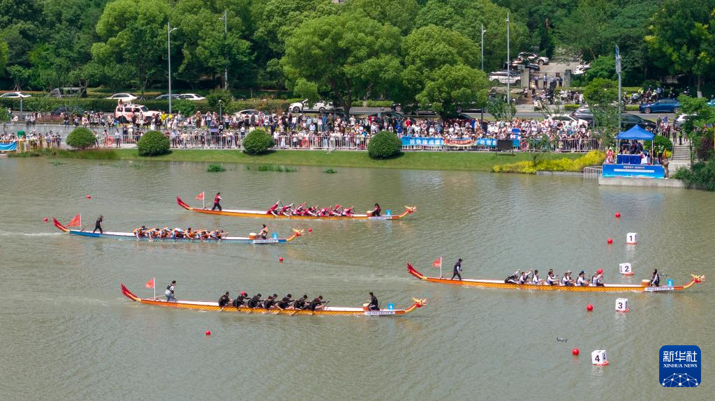 5月24日,龙舟队伍在南京玄武湖上竞逐(无人机照片)。