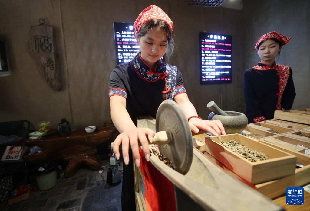 5月24日,在山东省临沂市沂南县铜井镇竹泉村,传统手工艺人在捣碎中药材,准备制作香囊。