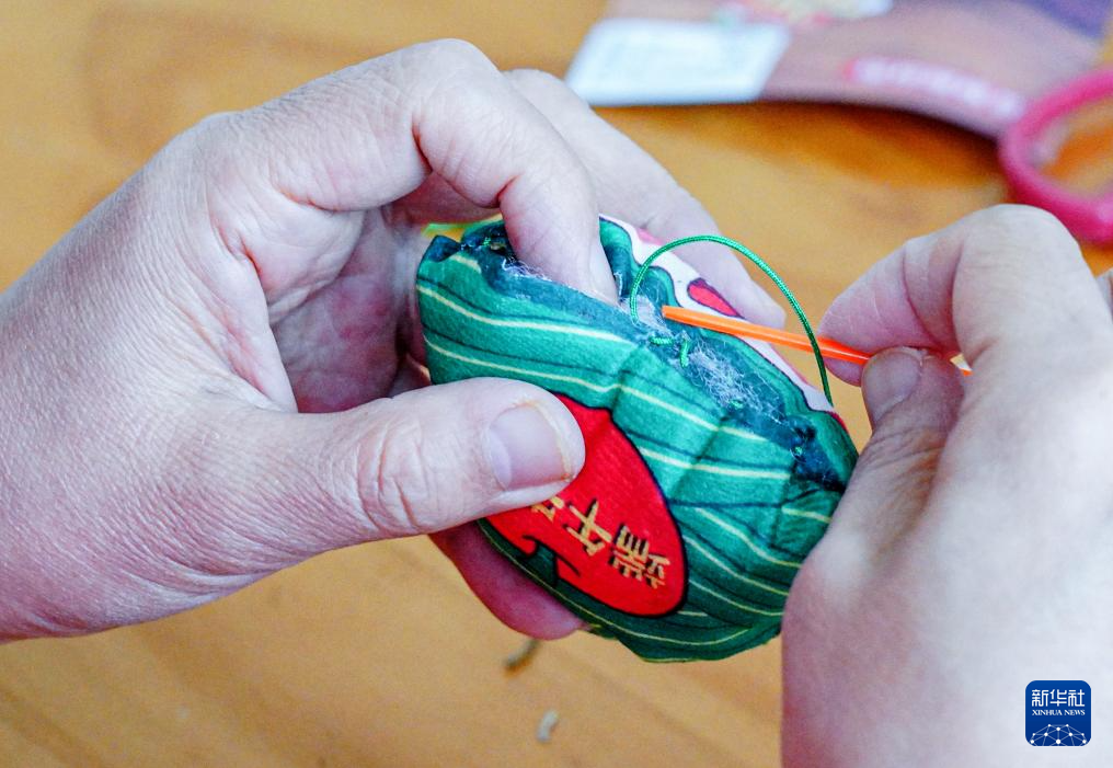 5月23日,志愿者在山东省荣成市新时代文明实践中心制作香囊,准备送给孤寡老人。