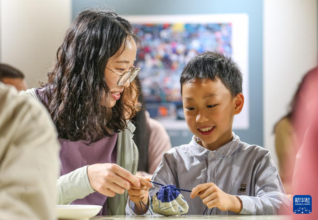 5月23日,在江苏省句容市葛仙湖公园,小朋友与家长体验香囊制作。