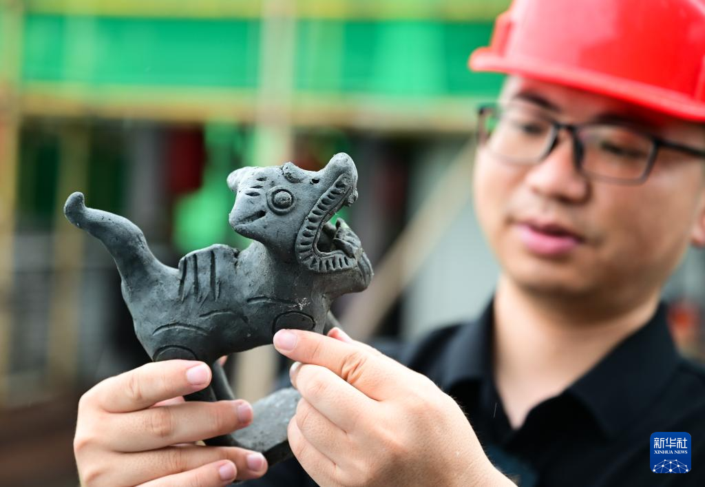 6月19日,周虎在歙县徽州古城南谯楼保养维护工程现场查看屋脊兽。