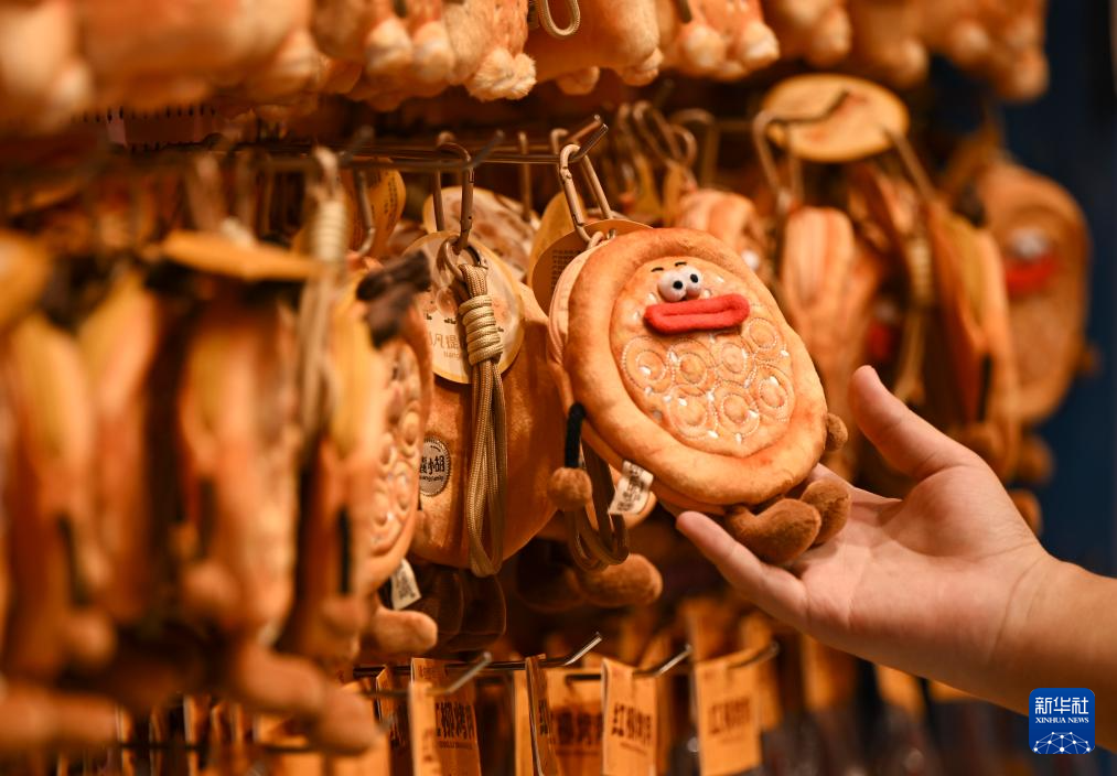 9月9日,在乌鲁木齐大巴扎步行街疆来城,游客选购馕主题的文创产品。