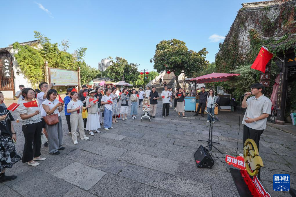 9月25日,在浙江省嘉兴市南湖区月河历史街区荷月桥广场上,新嘉街道的党员志愿者举行“文艺赋美”快闪表演,志愿者带领游客一起演唱《歌唱祖国》等爱国歌曲。