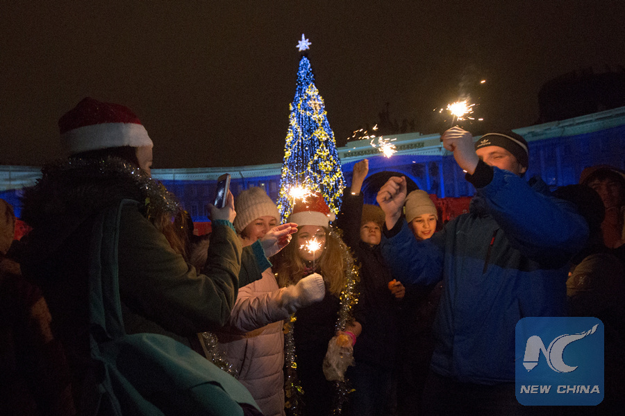 People celebrate the New Year's Day on Palace Square in St. Petersburg, Russia, on January 1, 2018. (Xinhua/Irina Motina)