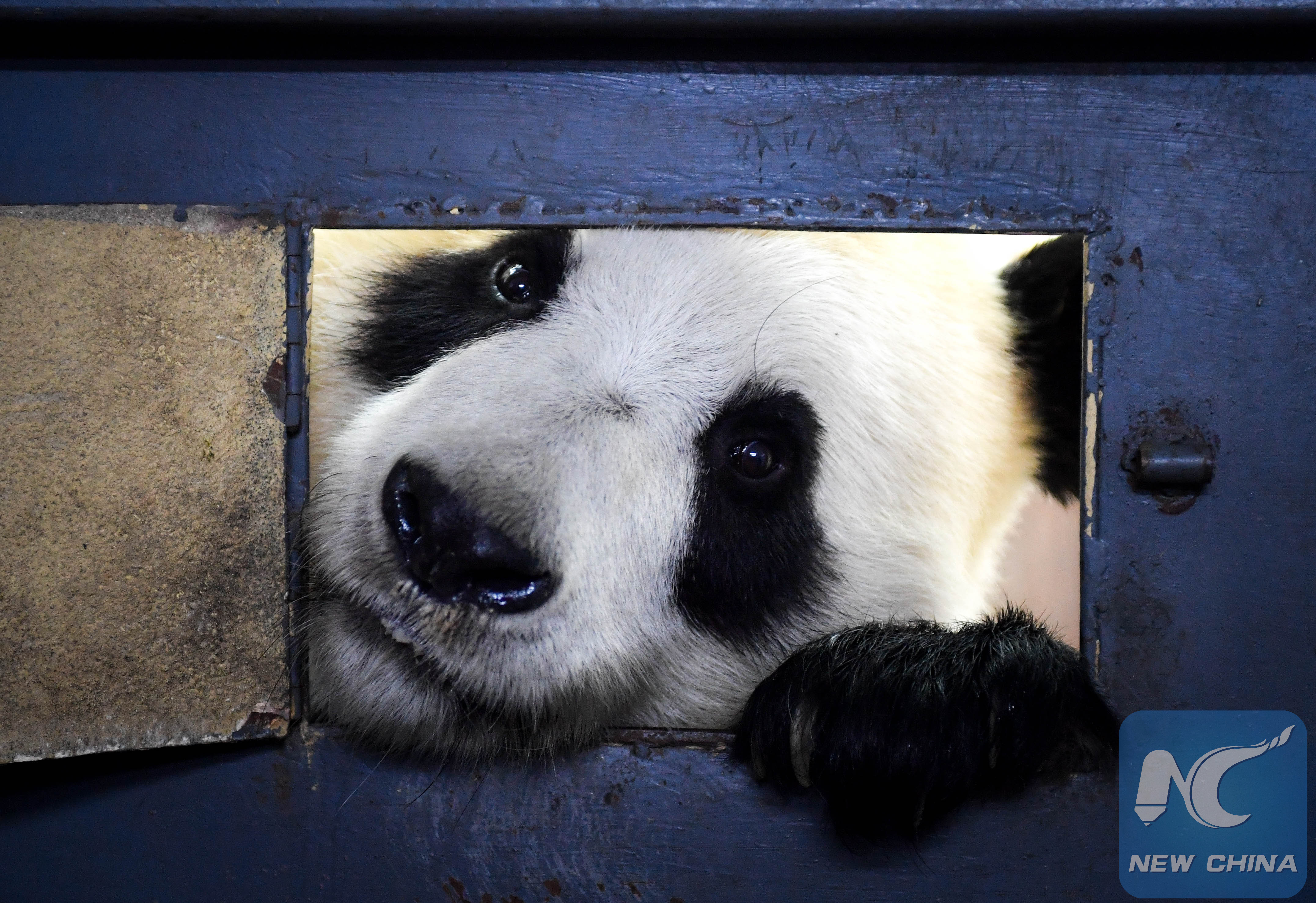 Giant panda Meng Meng is posing for photo in the Siberian Tiger Zoo in Changchun, capital of northeast China's Jilin Province. (XINHUA/Shao Meiqi)