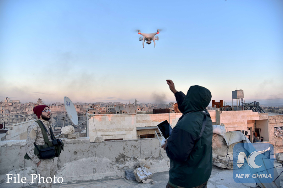A Syrian government soldier controls a drone to investigate the rebel-held area in Aleppo, Syria on Dec. 18, 2016. (Xinhua/Yang Zhen)