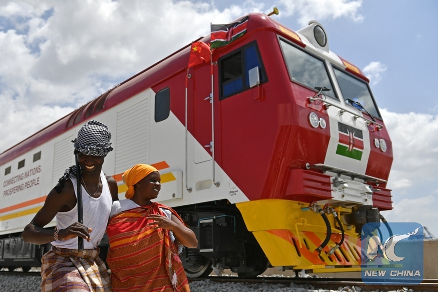 File Photo: Kenyans sing and dance beside one of the first batch of locomotives that were made by Chinese companies, for the Mombasa-Nairobi standard gauge railway, in Mombasa, Kenya, on Jan. 11, 2017. (Xinhua/Sun Ruibo)