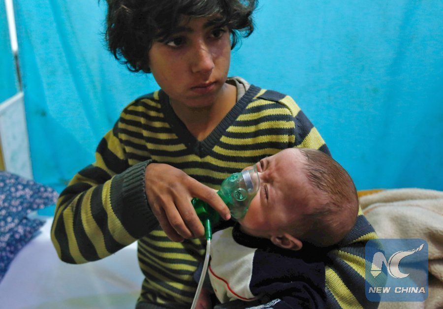 A Syrian boy holds an oxygen mask over the face of an infant at a make-shift hospital following a reported gas attack on the town of Douma in the eastern Ghouta region on the outskirts of the capital Damascus on January 22, 2018. (Xinhua/AFP)