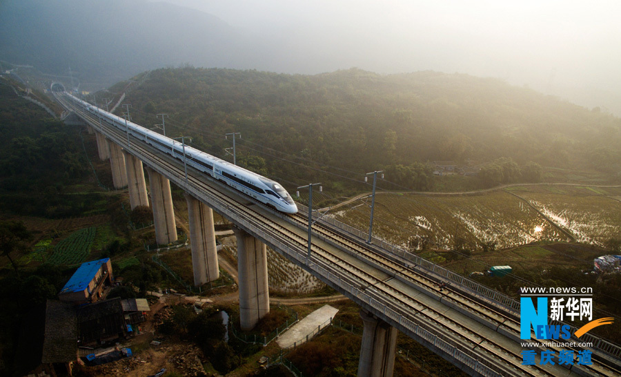 A bullet train runs on a viaductin Bishan County, southwest China's Chongqing Municipality on Dec. 26, 2015. The high speed rail (HSR) connecting Chengdu and Chongqing, both in southwest China, was open to operation on Saterday. The Chengdu-Chongqing high speed railway is 308 kilometers long with the operation speed of 300 kilometers per hour. (www.cq.xinhuanet.com/Chongqing UAV squadron)