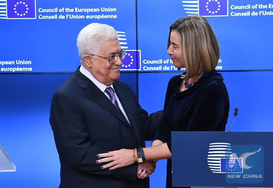Palestinian President Mahmud Abbas (L) is welcomed by EU foreign policy chief Federica Mogherini prior to attend a EU foreign affairs council at the European Council in Brussels, January 22, 2018. (AFP Photo)