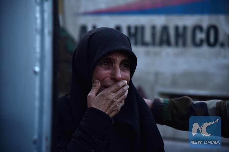 A woman evacuated from Idlib cries at the Jibreen temporary shelter, south of Aleppo, Syria, on Dec. 19, 2016. Hundreds of people were evacuated from Kafraya and Foa, two Shiite towns besieged by the rebels in the northwestern province of Idlib, to Jibreen. (Xinhua/Yang Zhen)
