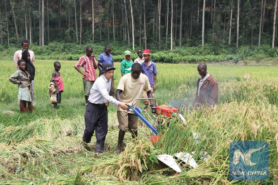 File photo taken on Dec. 19, 2013 shows a Chinese (Front L) assisting a Rwandese local how to cultivate land in Butare, Southern Province of Rwanda. (Xinhua)