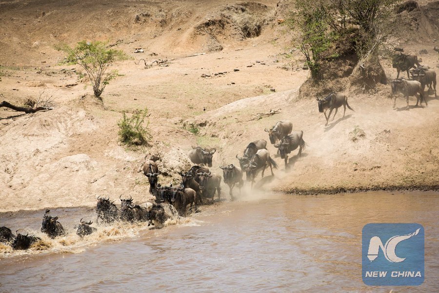 Wildebeests cross the Mara River at the Maasai Mara National Reserve, Kenya, Aug. 28, 2017. (Xinhua/Lyu Shuai)