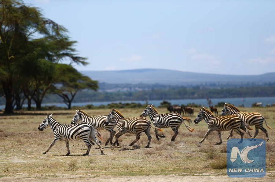 Zebras run at the Crescent Island in Lake Naivasha, Kenya, on March 19, 2017. Lake Naivasha is the second largest freshwater Lake in Kenya and a noted scenic spot for tourists. (Xinhua/Pan Siwei)