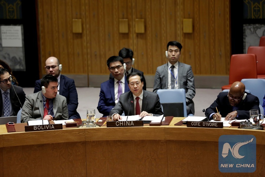 Chinese permanent representative to the United Nations Ma Zhaoxu (C, front) addresses after the UN Security Council adopted a resolution demanding a 30-day cease-fire in Syria, at the UN headquarters in New York, Feb. 24, 2018. (Xinhua/Li Muzi)