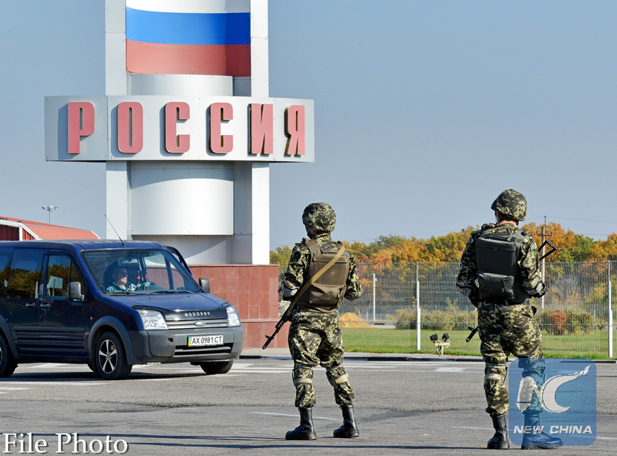 A file picture taken on October 15, 2014 shows servicemen of Ukrainian border standing guard at the Goptivka border crossing on the Urkainian-Russian border, north of Kharkiv, eastern Ukraine. (AFP Photo)
