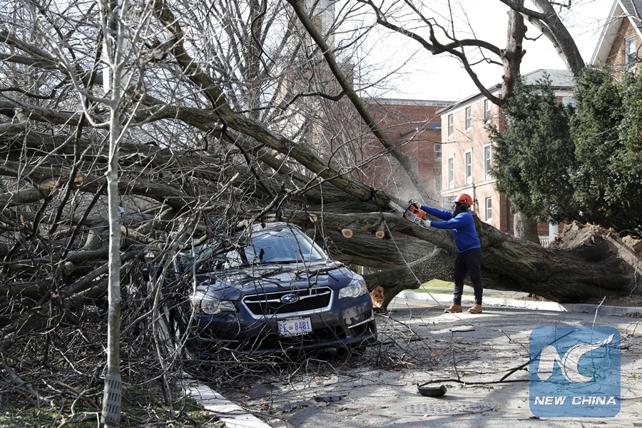 A worker cuts off branches of a tree blown down by high winds that blocked part of Woodley Road NW in Washington D.C., the United States, on March 2, 2018. (Xinhua/Li Muzi)