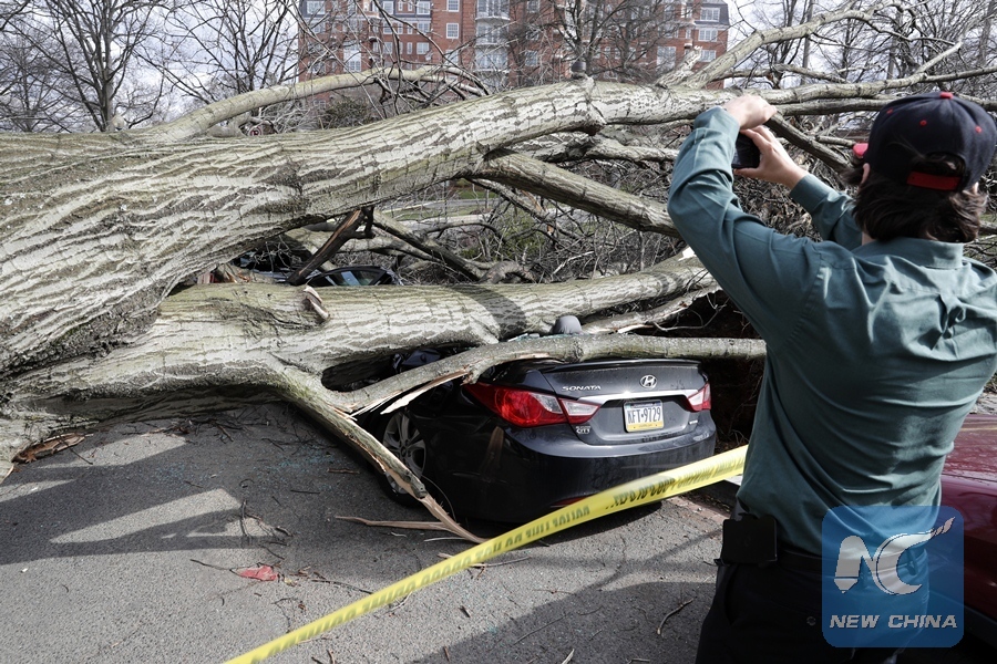A tree blown down by high winds blocks part of Woodley Road NW in Washington D.C., the United States, on March 2, 2018. (Xinhua/Li Muzi)