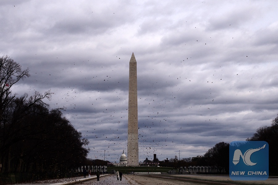 Leaves are blown into the air by high winds above Lincoln Memorial Reflecting Pool in Washington, the United States, on March 2, 2018. (Xinhua/Li Muzi)
