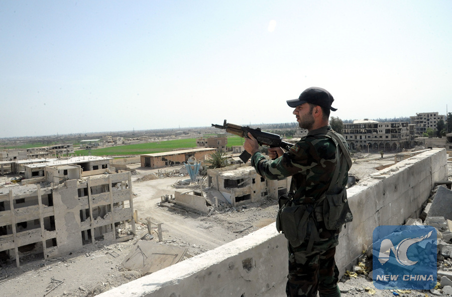 A Syrian soldier stands guard in the recently liberated Nashabiyeh town in the rebel-held Eastern Ghouta region, eastern countryside of Damascus, capital of Syria, on March 4, 2018. (Xinhua/Ammar Safarjalani)