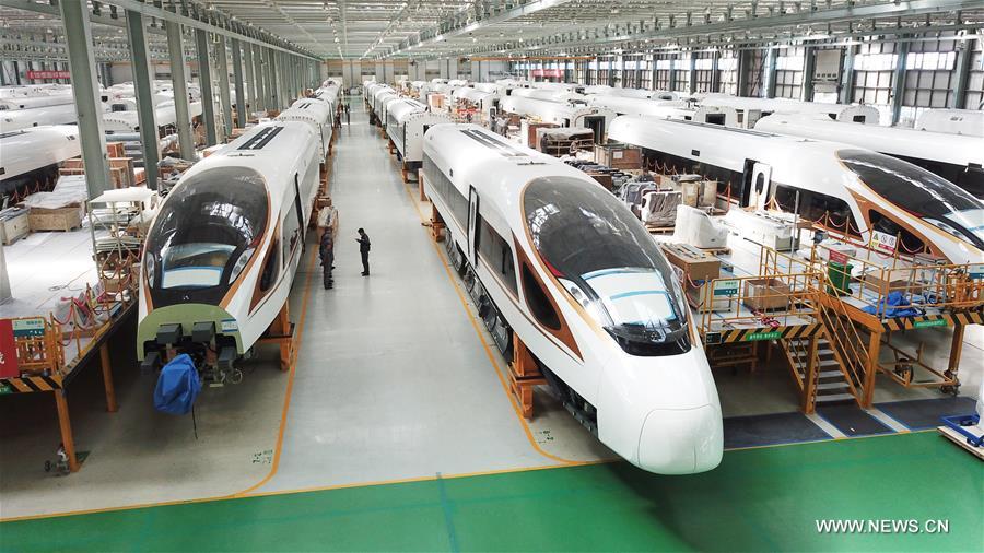 File photo taken on Sept. 14, 2017 shows Fuxing bullet trains at the assembly workshop at CRRC Changchun Railway Vehicles Co. Ltd. in Changchun, northeast China's Jilin Province. China aims to see economic expansion at around 6.5 percent this year, according to the government work report released Monday. The projected economic expansion this year should also be within reach without much difficulty, according to Chinese economic observers. This judgment is based on the prospect that China is to enjoy a thriving year for consumption, a higher-quality growth and a further opening-up market, which are expected to make China continue its role of stabilizing the global economy. (Xinhua/Zhang Nan)