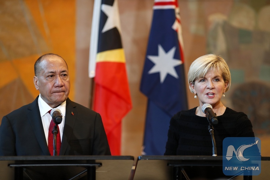Australian Foreign Minister Julie Bishop (R) and Hermenegildo Augusto Cabral Pereira, Timor-Leste minister in the office of the prime minister for the delimitation of borders, attend a press conference after signing a maritime boundaries treaty at the United Nations headquarters in New York, March 6, 2018. Australia and Timor-Leste on Tuesday signed a maritime boundaries treaty under the auspices of the United Nations. (Xinhua/Li Muzi)