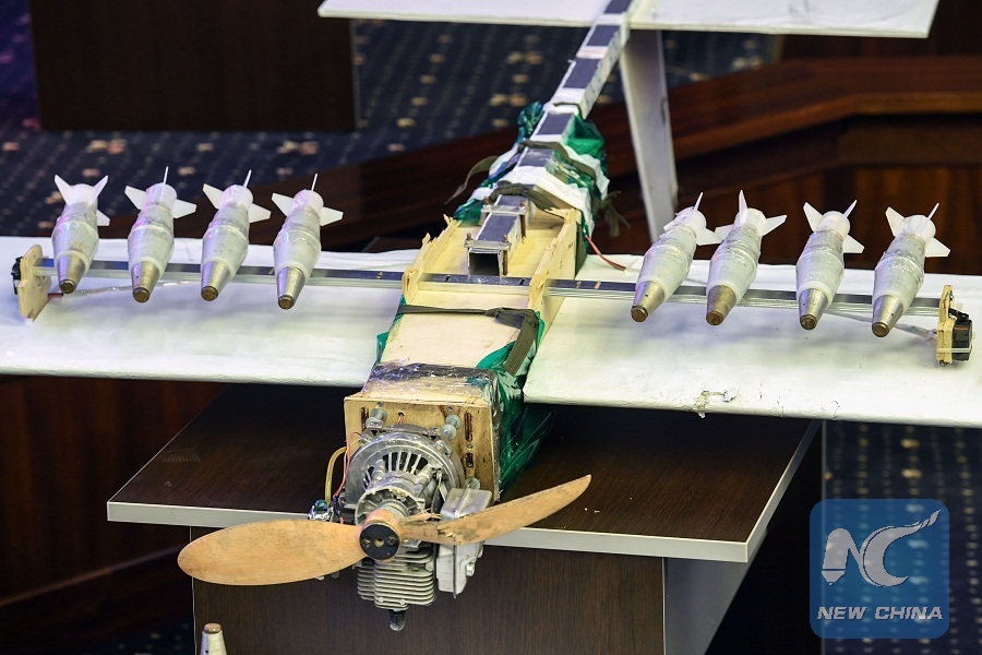 A view of a drone allegedly used during recent attacks on Russia's bases in Syria, at a briefing in the Russian Defence Ministry headquarters in Moscow on January 11, 2018. (AFP Photo)