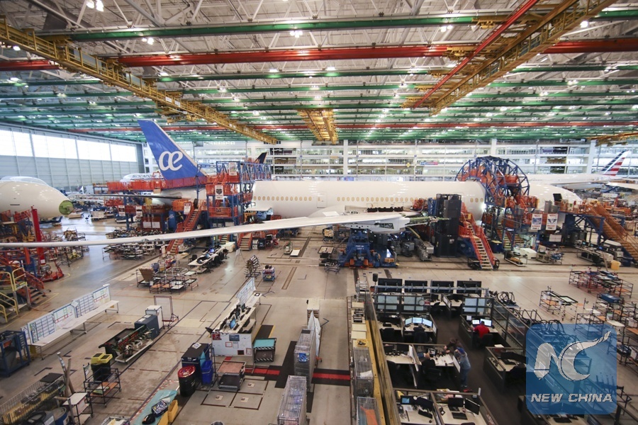 Photo taken on Jan. 26, 2018 shows interior of the final assembly building in BoeingSouth Carolina in North Charleston, South Carolina of the United States. With around 7,000 employees, the factory is the second Boeing facility for the final assembly of 787 Dreamliner planes. (Xinhua/Wang Ying)