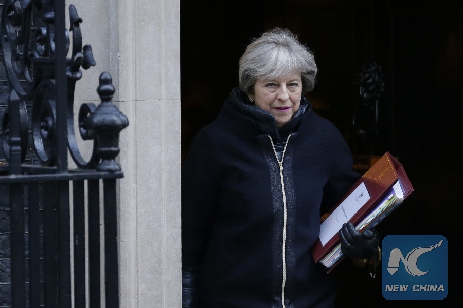 File Photo: British Prime Minister Theresa May leaves 10 Downing Street for Prime Minster's Questions at the House of Commons, in London, Britain, on Jan. 17, 2018. (Xinhua/Tim Ireland)