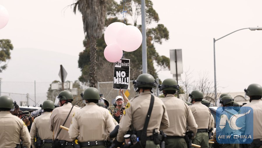 A man (C) protests near the border wall prototypes in San Diego, the United States, on March 13, 2018. (Xinhua/Li Ying)