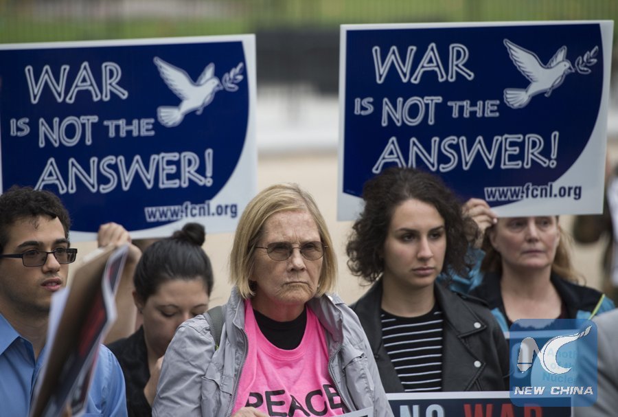 People hold up signs during a protest calling for the Trump administration to continue diplomacy with Iran near the White House in Washington, D.C. on Oct. 12, 2017. (Xinhua/AFP)