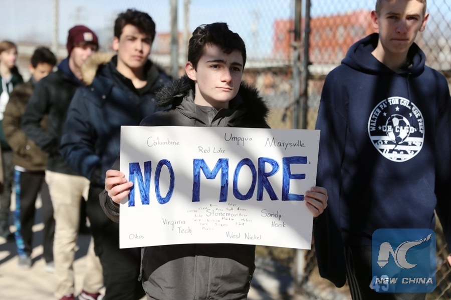 NEW YORK, March 15 (Xinhua) -- In an unprecedented move in recent U.S. history, thousands of high school students walked out of class across the country on Wednesday in a call on Congress to pass tighter gun-control laws.