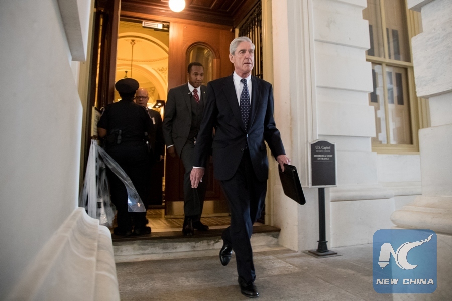 File Photo: Former FBI Director Robert Mueller (front), the special counsel probing Russian interference in the 2016 U.S. election, leaves the Capitol building after meeting with the Senate Judiciary Committee on Capitol Hill in Washington D.C., the United States, on June 21, 2017. (Xinhua/Ting Shen)