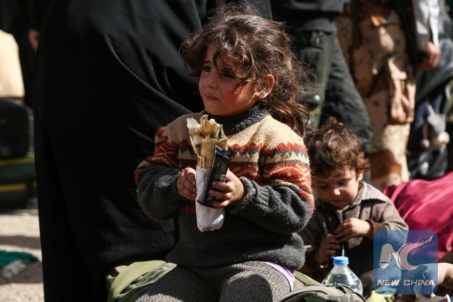 Children wait to be transferred to a safe shelter from the Hamouriyeh area in Eastern Ghouta of Damascus, Syria, on March 17, 2018. As many as 30,000 civilians evacuated from rebel-held areas in the Syrian capital Damascus' Eastern Ghouta area on Saturday, state news agency SANA reported. (Xinhua/Ammar Safarjalani)