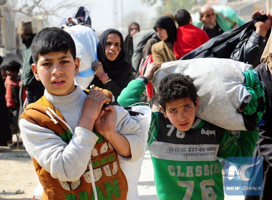 Syrians leave Hamouriyeh area in Eastern Ghouta of Damascus, Syria, on March 17, 2018. As many as 30,000 civilians evacuated from rebel-held areas in the Syrian capital Damascus' Eastern Ghouta area on Saturday, state news agency SANA reported. (Xinhua/Ammar Safarjalani)